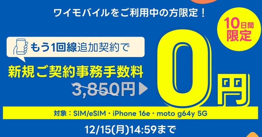 SIMカード/eSIM特典の場合は、シンプル3 M/Lに申し込みと同時にデータ増量オプションに加入、PayPayポイントコードを開通月の翌々月末までにPayPayチャージ期間 2025年12月5日~12月15日15:00 「ワイモバイル追加申込キャンペーン」は、もう1回線追加申込をすると、SIMカード/eSIM特典が通常より5,000円増額で15,000円相当還元されます。